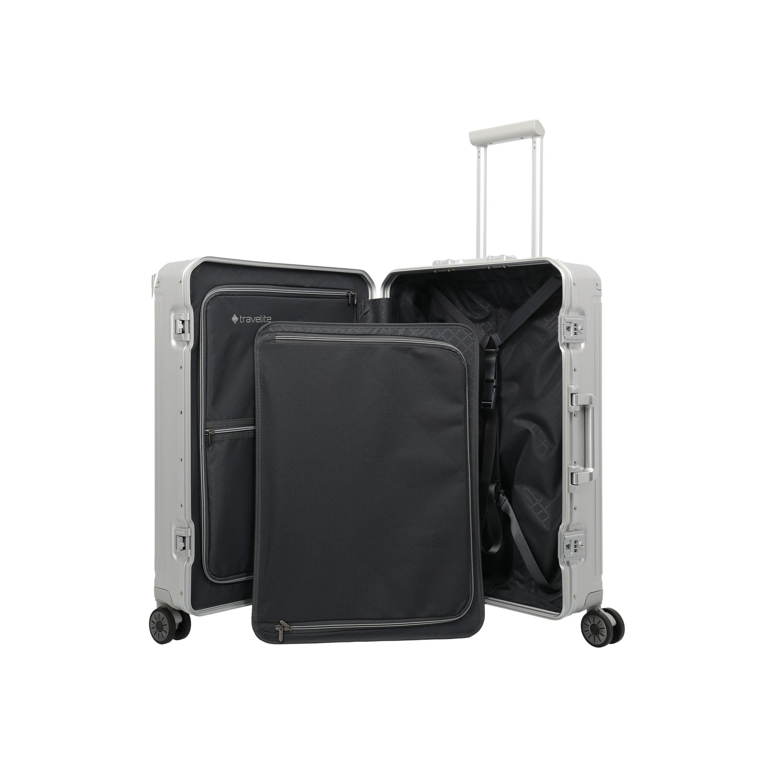 En perle når det kommer til organisering. Travelite Next Trolley i størrelse Medium er den perfekte følgesvend på rejser, der varer flere dage. Kufferten er elegant, men diskret, og fremhæver din stil på bedste vis. Den er fremstillet af høj kvalitet, robust aluminium og imponerer ikke kun med sit udseende og førsteklasses håndværk, men også med sine mange funktioner. Interiøret er rummeligt, og det slidstærke inderfor giver ekstra beskyttelse til sarte tekstiler. Indholdet i kufferten holdes sikkert på plads og er overskueligt takket være de funktionelle inderlommer. Packpladen er et sandt højdepunkt og kan placeres som skillevæg, bruges til rejsetilbehør eller fjernes helt – perfekt også for dig, der elsker orden på rejsen.