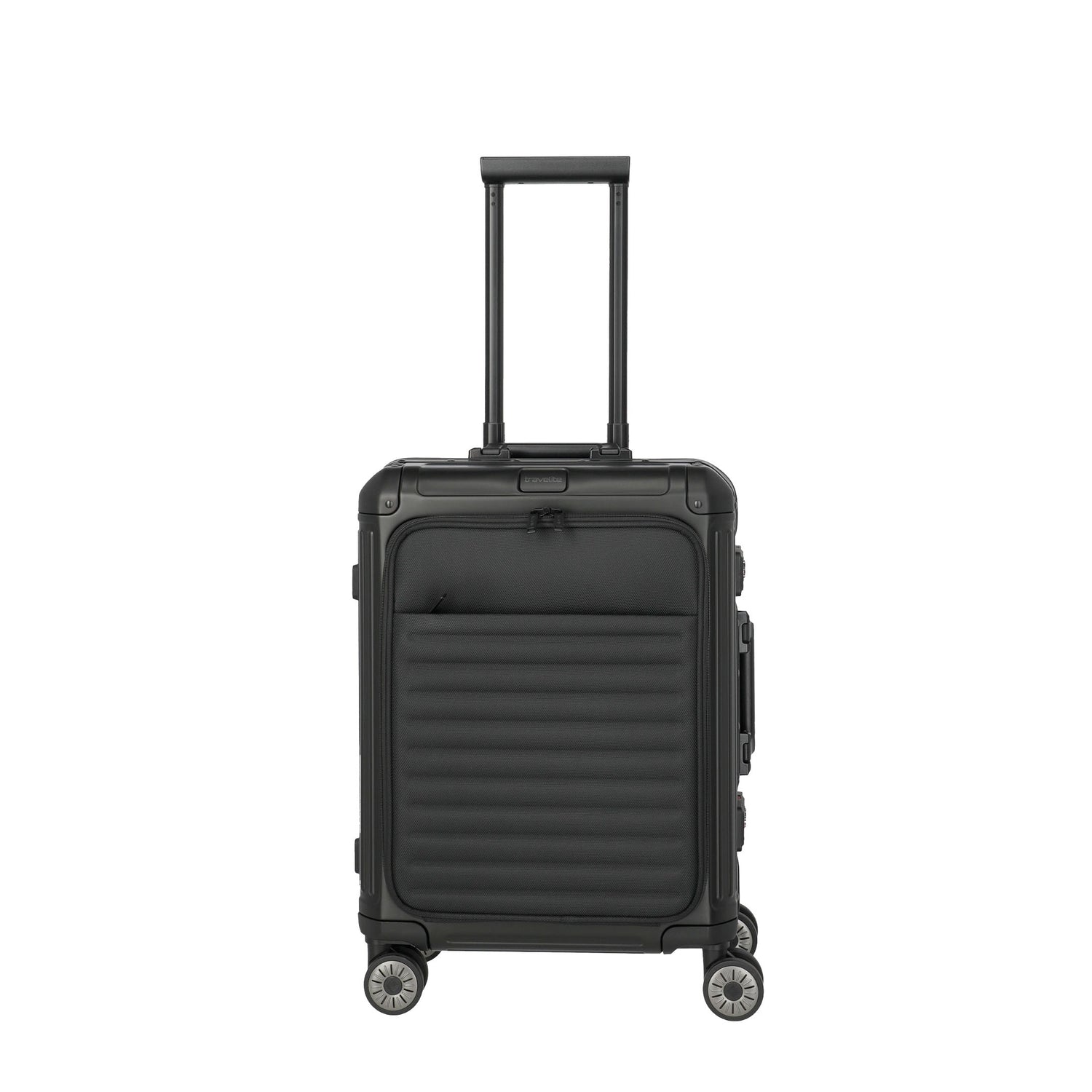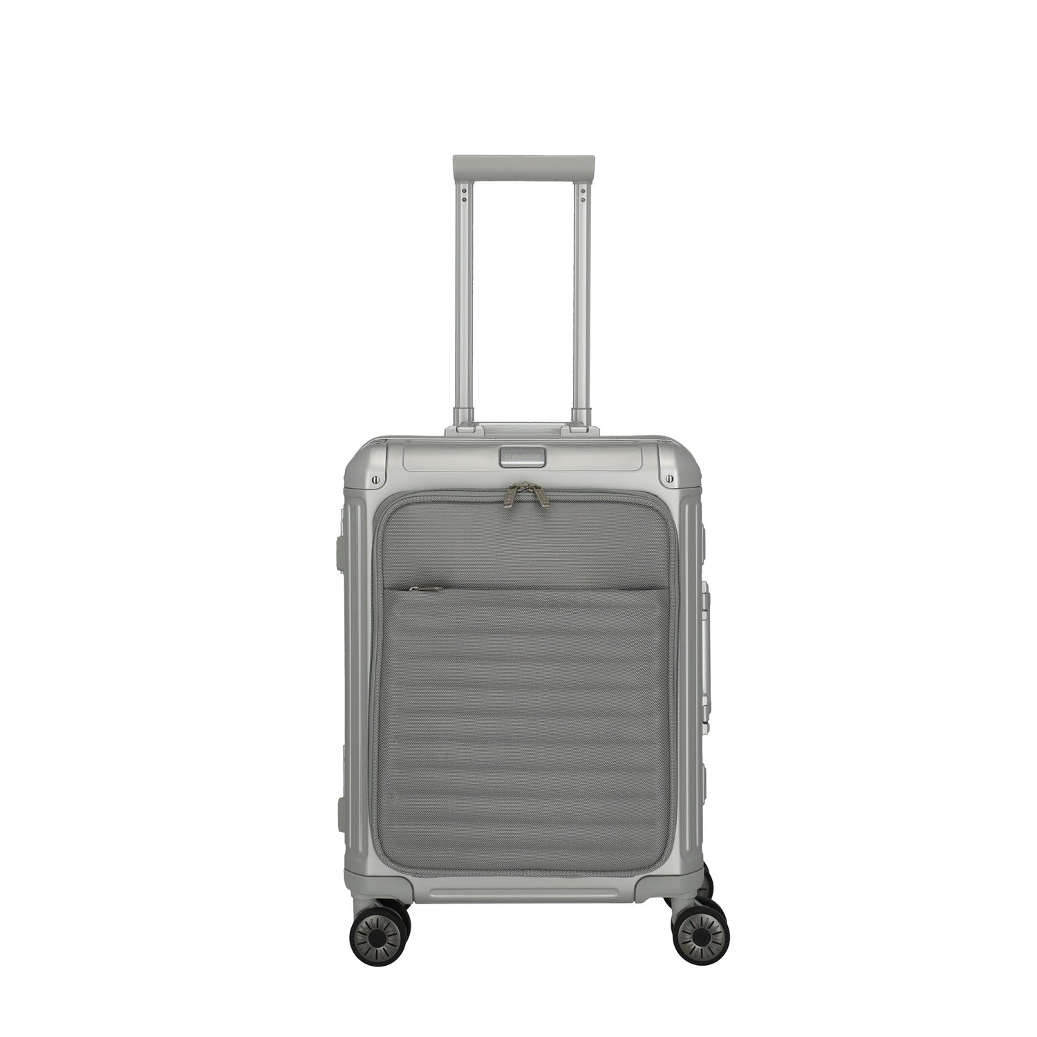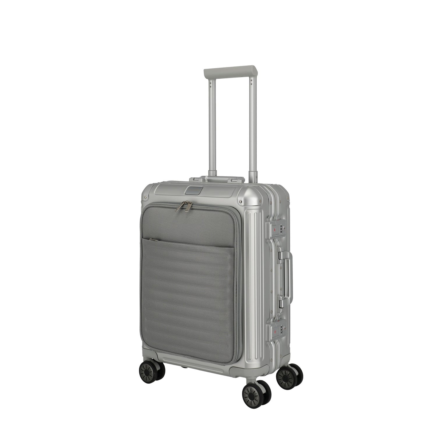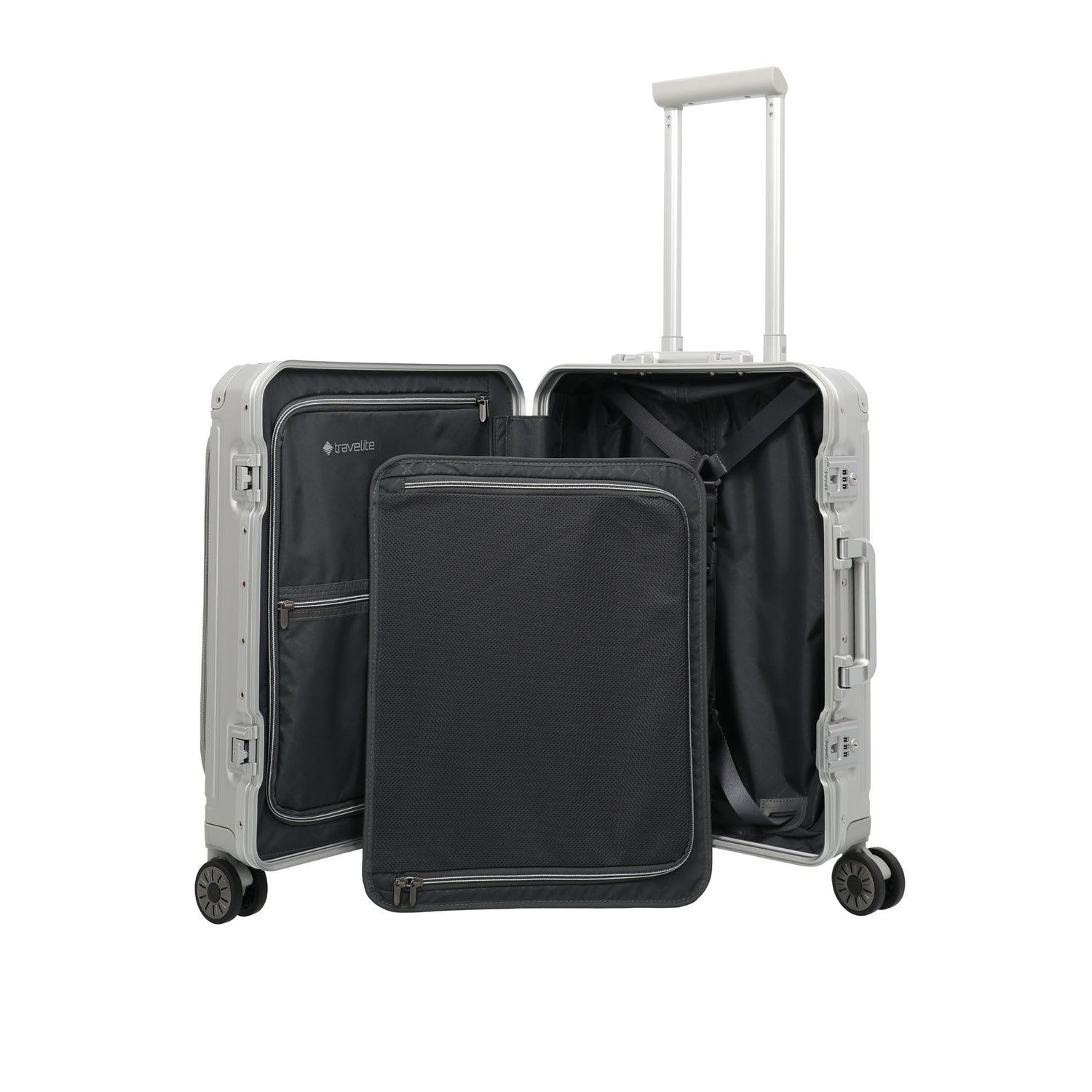 Du kan stole på dit bagage! Med Travelite Next Trolley i størrelsen Small træffer du det rette valg. Den er fremstillet af høj kvalitets aluminium og imponerer med sit elegante, diskrete udseende og førsteklasses håndværk. Interiøret er rummeligt, og det slidstærke foer giver ekstra beskyttelse til sarte tøjgenstande. Den gennemtænkte skillevæg, med integreret pakkefolie og mange lommer, sikrer også ekstra orden. Pakkefladen er et ægte højdepunkt og kan placeres som skillevæg, bruges til rejsetilbehør eller fjernes helt. Den unikke yderlomme foran betyder, at private og forretningsrelaterede ting kan adskilles og være let tilgængelige. Åbn blot lynlåsen på yderlommen for nem adgang til din bærbare computer, nøgler, dokumenter eller din flybillet – perfekt for dig, der vil være organiseret på forretnings- eller weekendturen.