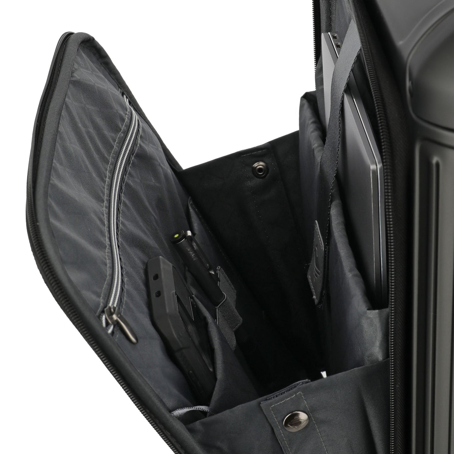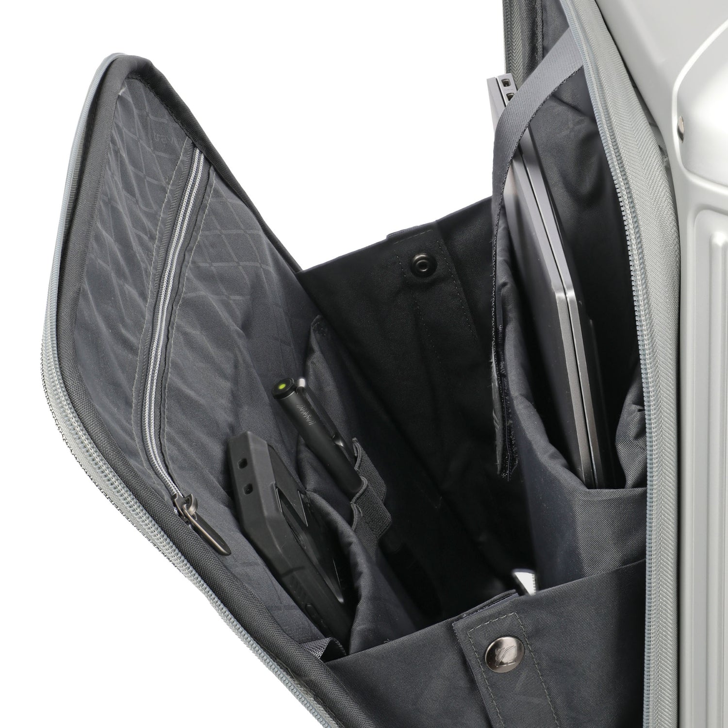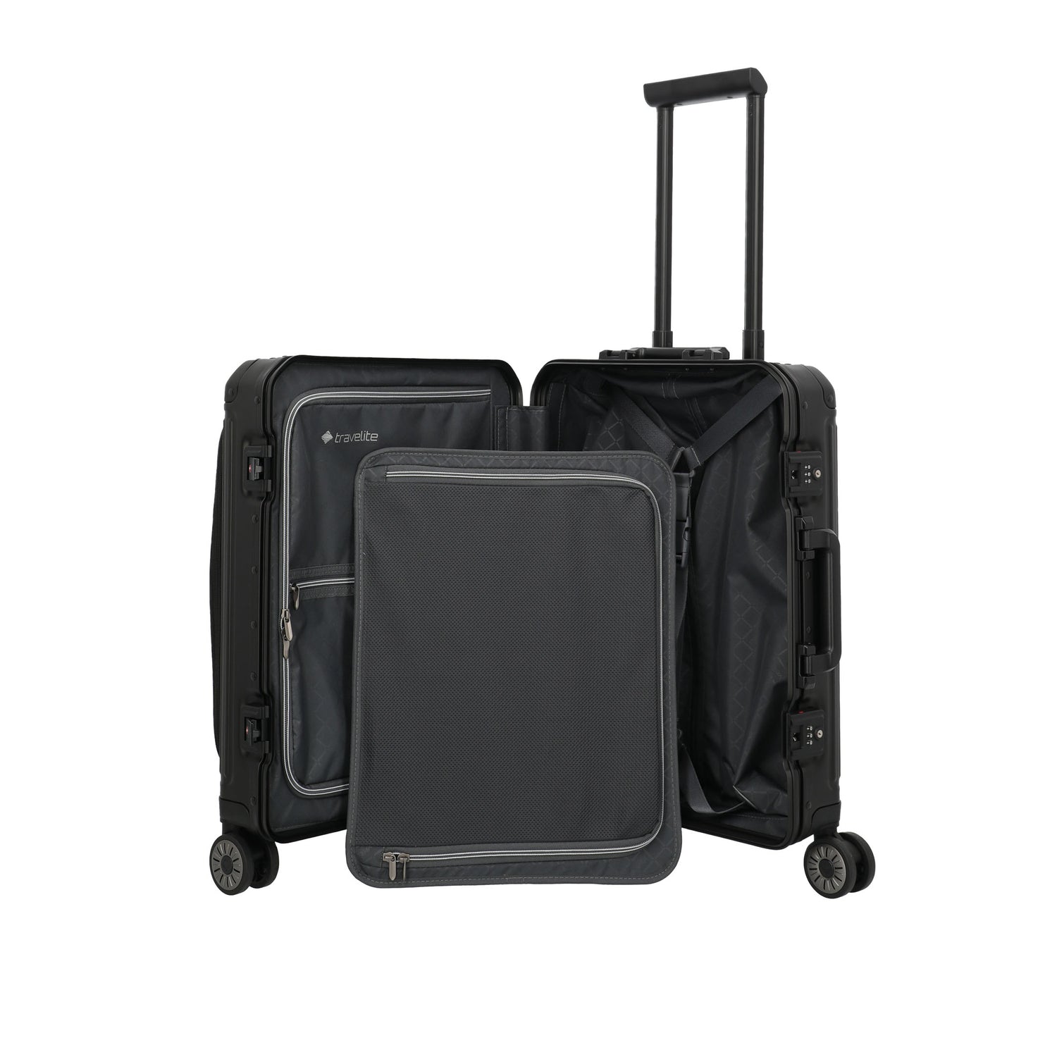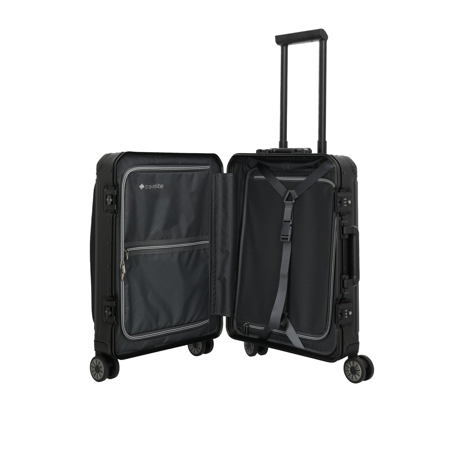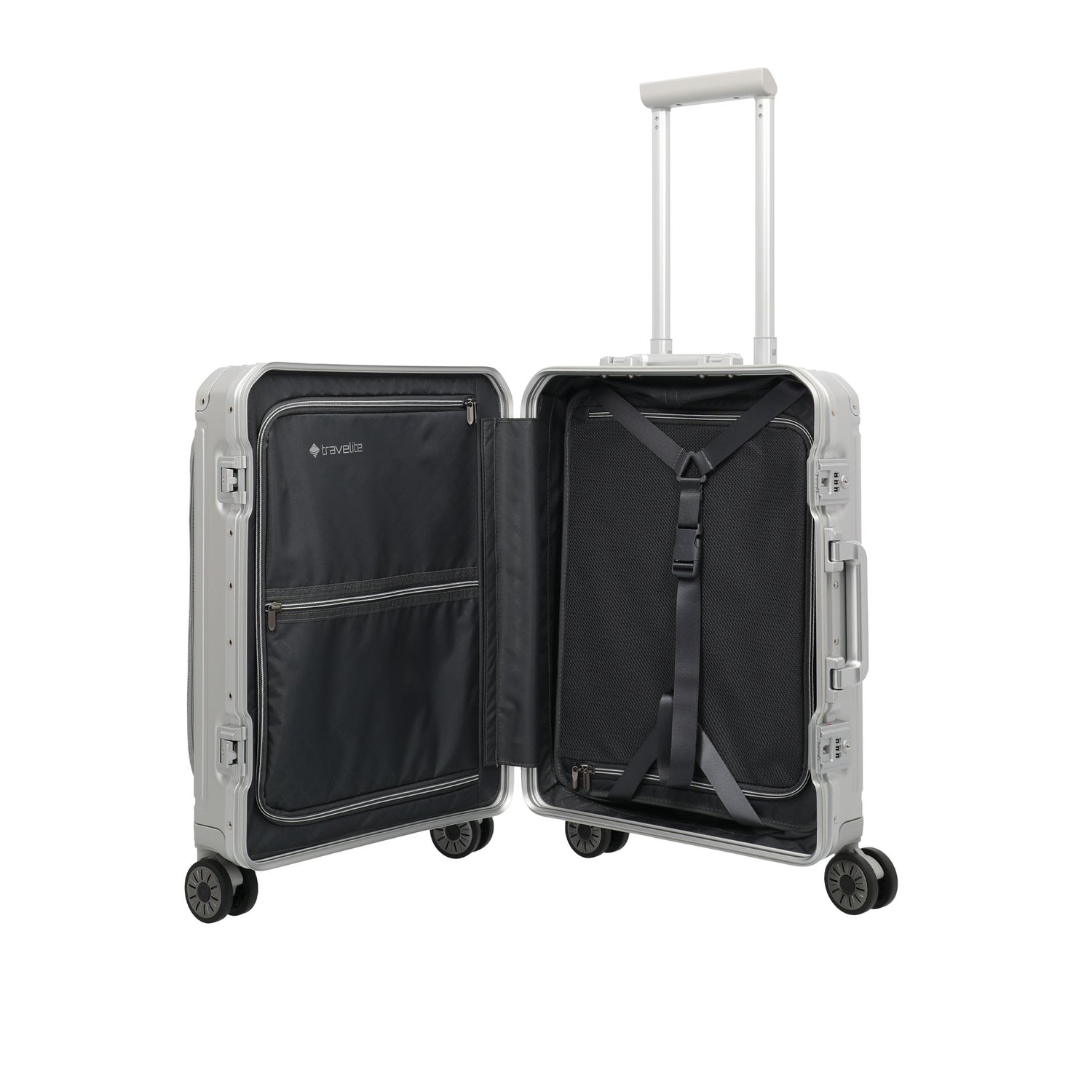 Du kan stole på dit bagage! Med Travelite Next Trolley i størrelsen Small træffer du det rette valg. Den er fremstillet af høj kvalitets aluminium og imponerer med sit elegante, diskrete udseende og førsteklasses håndværk. Interiøret er rummeligt, og det slidstærke foer giver ekstra beskyttelse til sarte tøjgenstande. Den gennemtænkte skillevæg, med integreret pakkefolie og mange lommer, sikrer også ekstra orden. Pakkefladen er et ægte højdepunkt og kan placeres som skillevæg, bruges til rejsetilbehør eller fjernes helt. Den unikke yderlomme foran betyder, at private og forretningsrelaterede ting kan adskilles og være let tilgængelige. Åbn blot lynlåsen på yderlommen for nem adgang til din bærbare computer, nøgler, dokumenter eller din flybillet – perfekt for dig, der vil være organiseret på forretnings- eller weekendturen.
