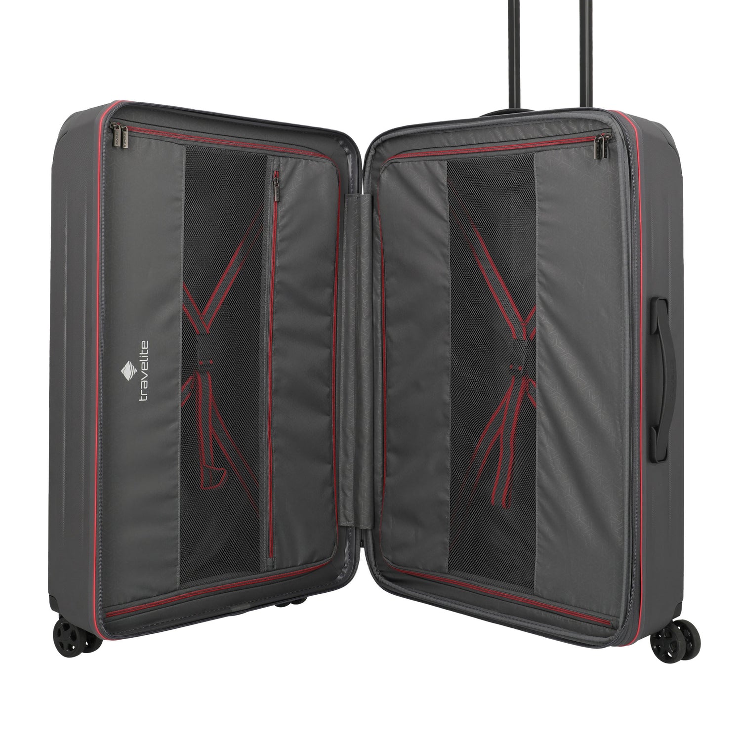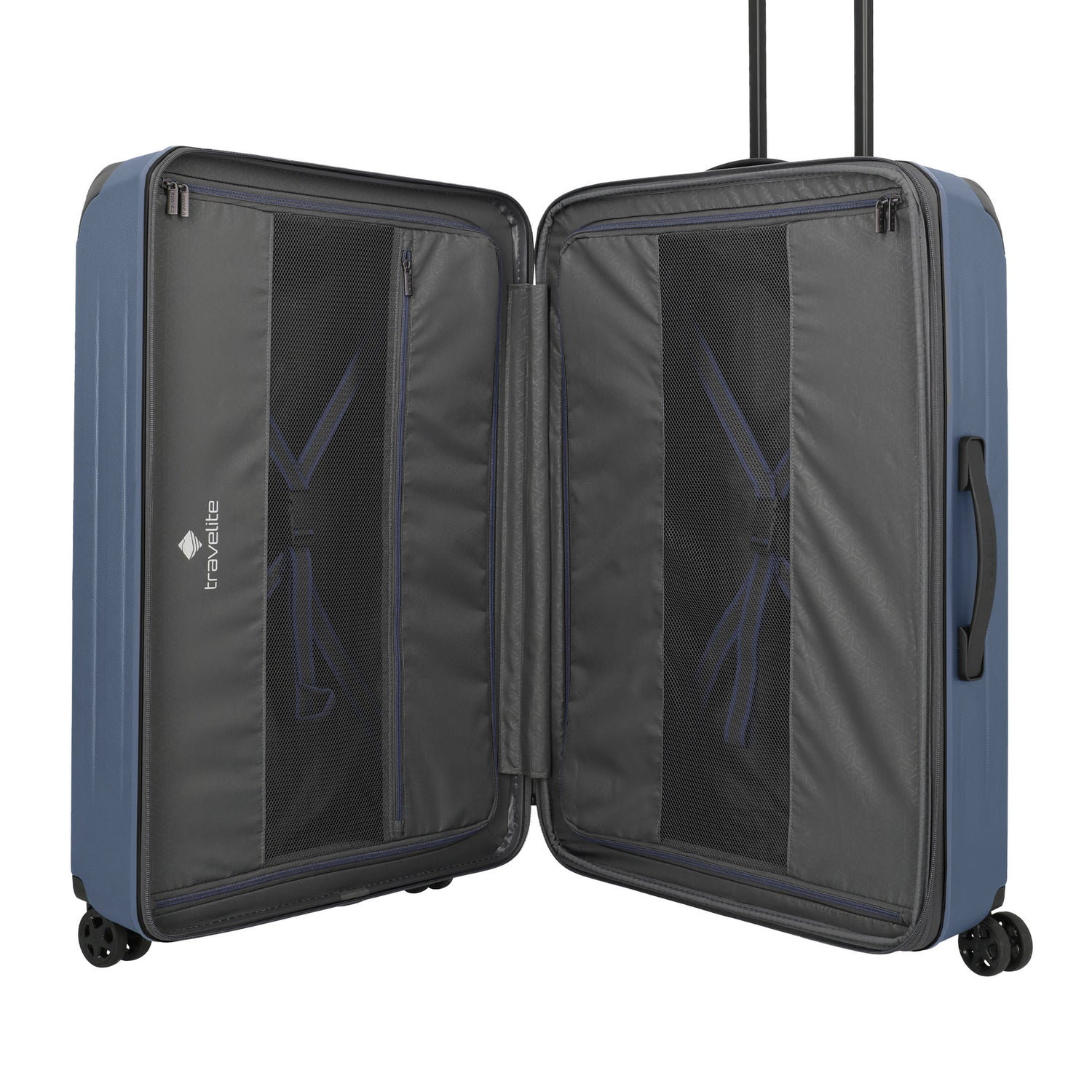 Mer utrymme för mer frihet! Resväskan Dynamiic i storlek Large från Travelite är perfekt för längre resor. Interiören är extremt rymlig och kan dessutom utökas vid behov. Det luftiga innerfodret ger extra skydd för ömtåliga kläder. Innehållet i väskan hålls stadigt på plats och är överskådligt hela tiden tack vare det högkvalitativa fodret, de elastiska packremmarna och de båda packväggarna med smarta fickor. Med de förstärkta hörnskydden och den reptåliga ytan är ditt bagage väl skyddat.